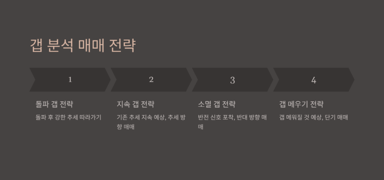 갭은 매매 기회를 효과적으로 포착하는 데 중요한 역할을 합니다. 다음은 갭을 활용한 주요 매매 전략입니다.