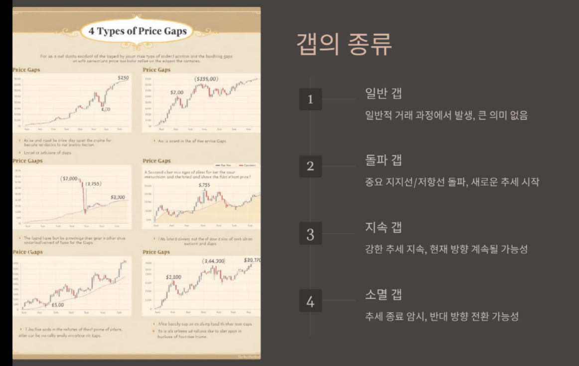 갭에는 여러 종류가 있으며, 각 갭은 시장의 특정한 움직임과 상황을 반영합니다. 대표적인 갭의 종류는 다음과 같습니다.