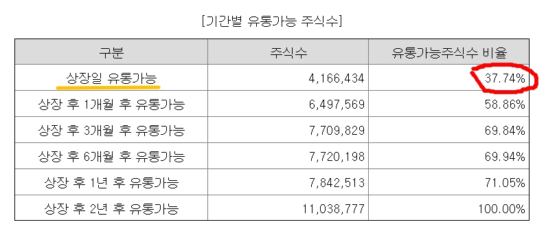 유통가능 주식 비율이 상장 직후 높은 편에 속한다. 특히 기관 물량 중 확약이 전무하므로, 초기 유통물량 부담은 상당할 전망이다.
