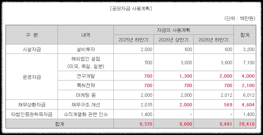 이번 상장은 전량 신주 발행으로 진행되며, 총 공모금액 중 약 46억 원은 채무 상환에, 나머지는 연구개발 및 생산능력 확충에 투입될 예정이다.