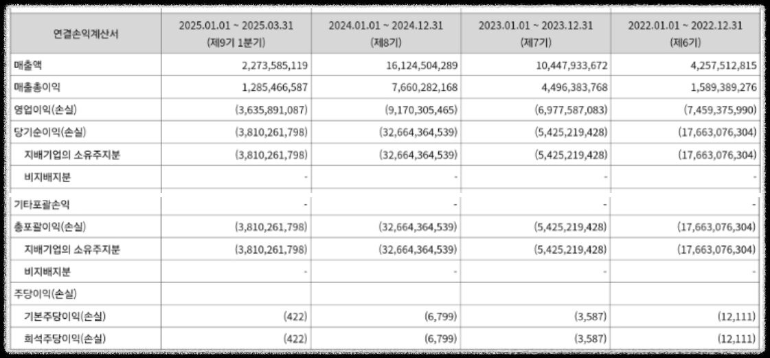 - 2024년: 영업이익 -15억 원, 순이익 -18억 원