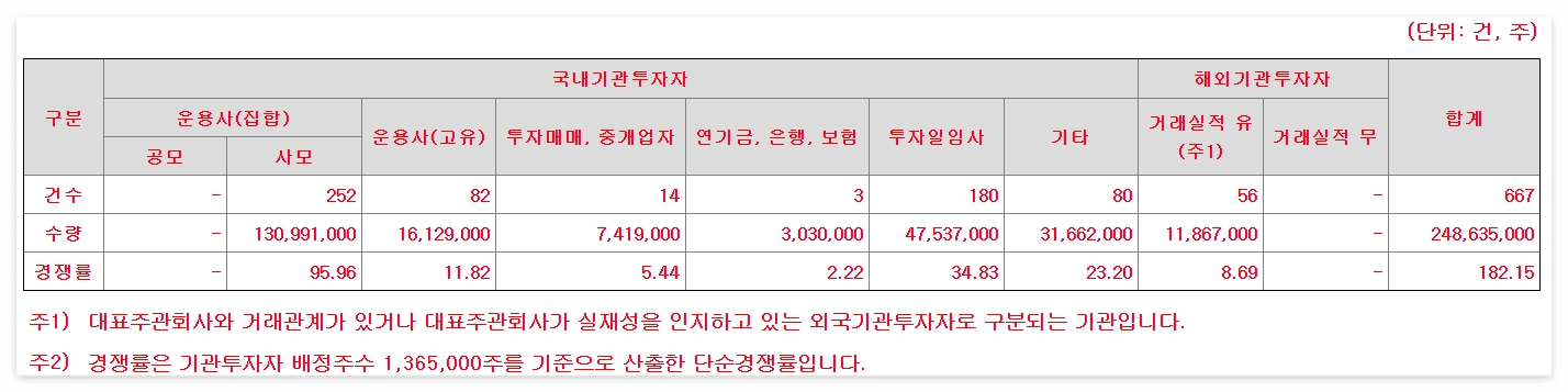 이번 공모의 기관 투자자 수요예측 경쟁률은 낮은 편이며, 의무보유 확약 비율이 0%로 나타났다.