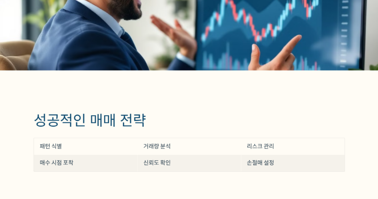 - 거래량의 변화: 일반적으로 패턴이 형성될 때 거래량은 점차 감소하다가, 저항선을 돌파하는 순간 거래량이 급증하는 것이 이상적입니다. 이는 매수세가 본격적으로 유입되고 있음을 의미합니다.