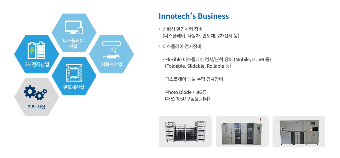 이노테크의 핵심 제품은 복합 신뢰성 환경시험 장비입니다. 이는 전자제품이 온도, 습도, 진동, 진공 등 열악한 조건에서 성능이나 내구성에 문제가 없는지 검증하는 장비입니다. 주요 납품처는 삼성디스플레이 등이 있으며 디스플레이·반도체 산업 등을 대상으로 서비스를 제공하고 있습니다.