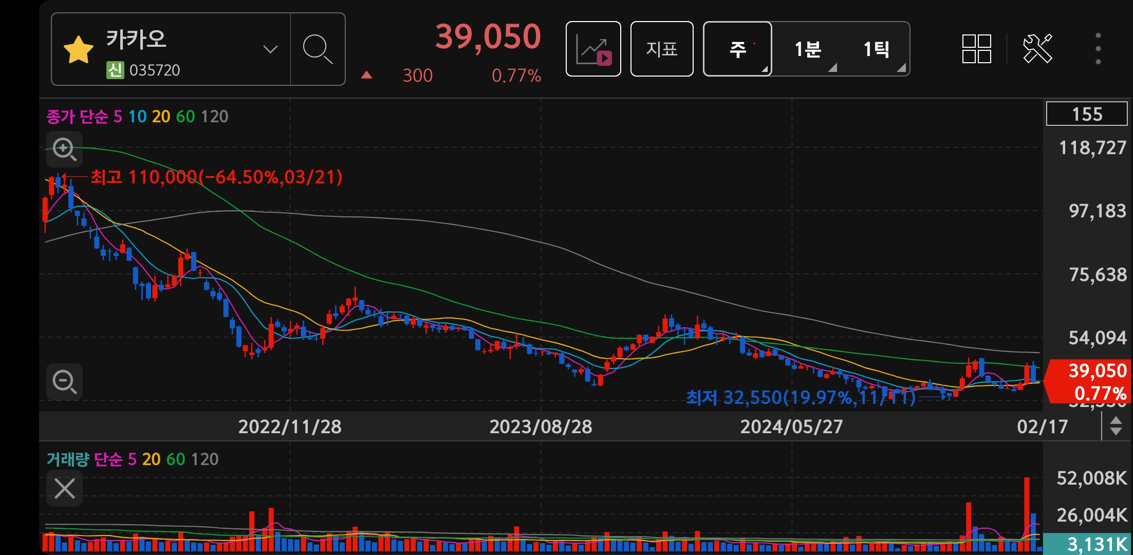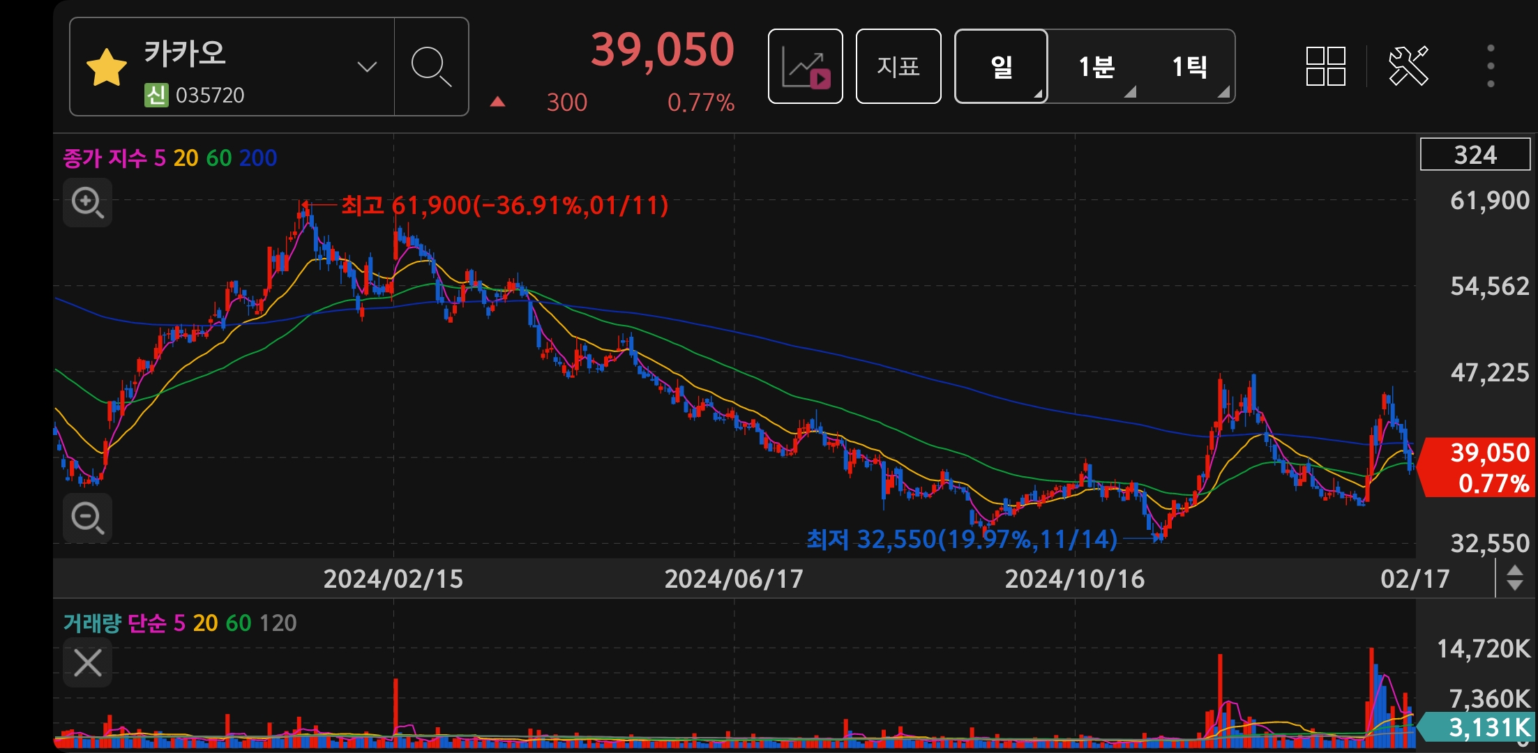 한때 국민주로 불리며 17만 3천 원까지 올랐던 카카오 주가가 77% 하락하면서 현재 38,750원(2025년 2월 17일 기준)까지 내려왔습니다.