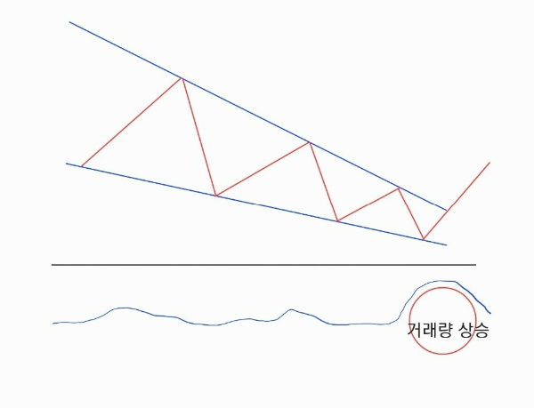 3. 상승 돌파 시점: 주가가 두 추세선 중 상단의 저항선을 돌파할 때 거래량이 증가하며, 강력한 매수 신호가 발생합니다. 이때 거래량이 증가하는 것은 중요한 확인 요소입니다.